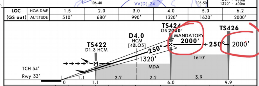 The answer is: Pilots can cross TS426 at or above 2000‘ and need to maintain 2000‘ mandatory at TS424.